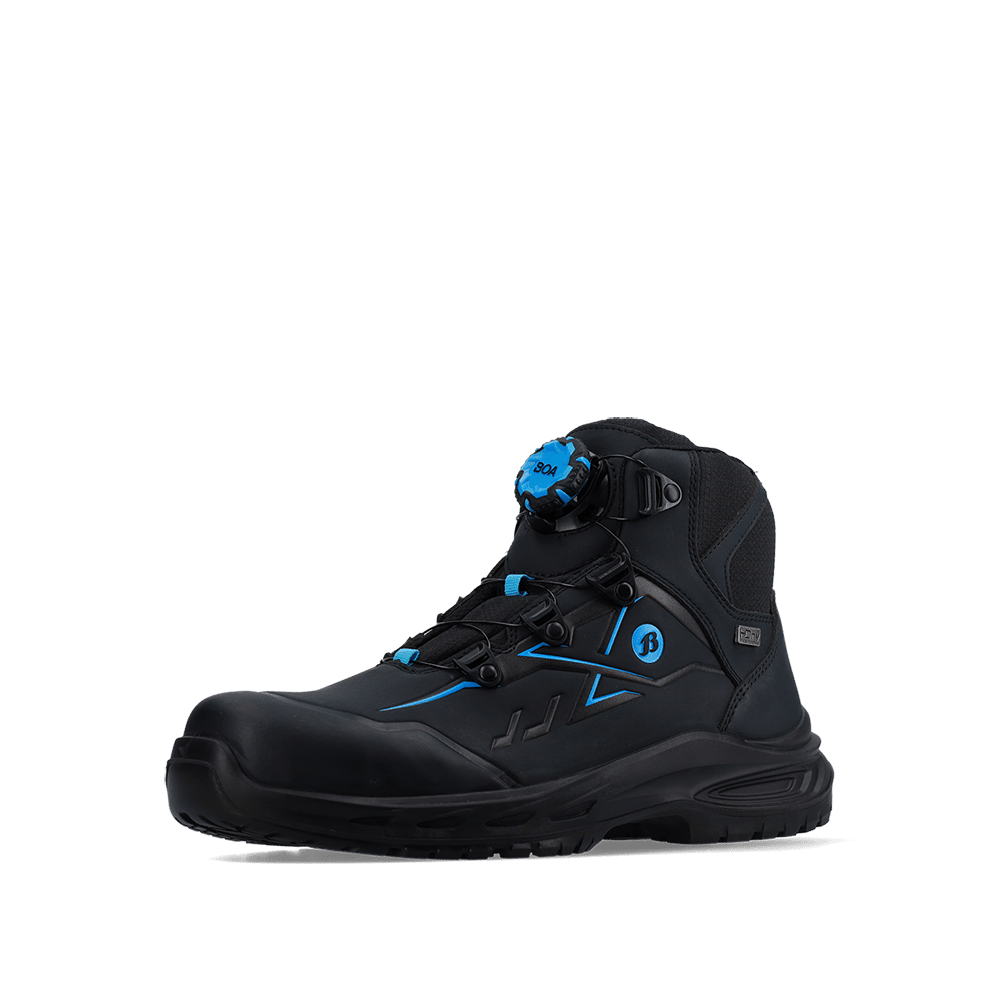 De STONE is een S7S veiligheidsschoen ontworpen voor ultieme bescherming en de beste flexibele pasvorm. De schoen is voorzien van een HDry membraan, waardoor hij waterafstotend is, en het robuuste BOA® Fit System zorgt voor een snel en eenvoudig instelbare pasvorm. Met een FlexGuard antiperforatiezool en een aluminium veiligheidsneus is dit hoge zwarte model met Bata blauwe details ideaal voor natte buitenomgevingen.