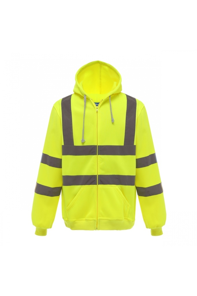 100% anti-pilling polyester. Twee 5 cm brede reflectiebanden rond het lichaam en armen, en één over elke schouder. Capuchon met trekkoord. Rits over de volledige lengte vooraan. Ribgebreide manchetten en tailleband. Afwerking met dubbele stiksels. Hi Vis Yellow EN ISO20471 Class 3 conform.